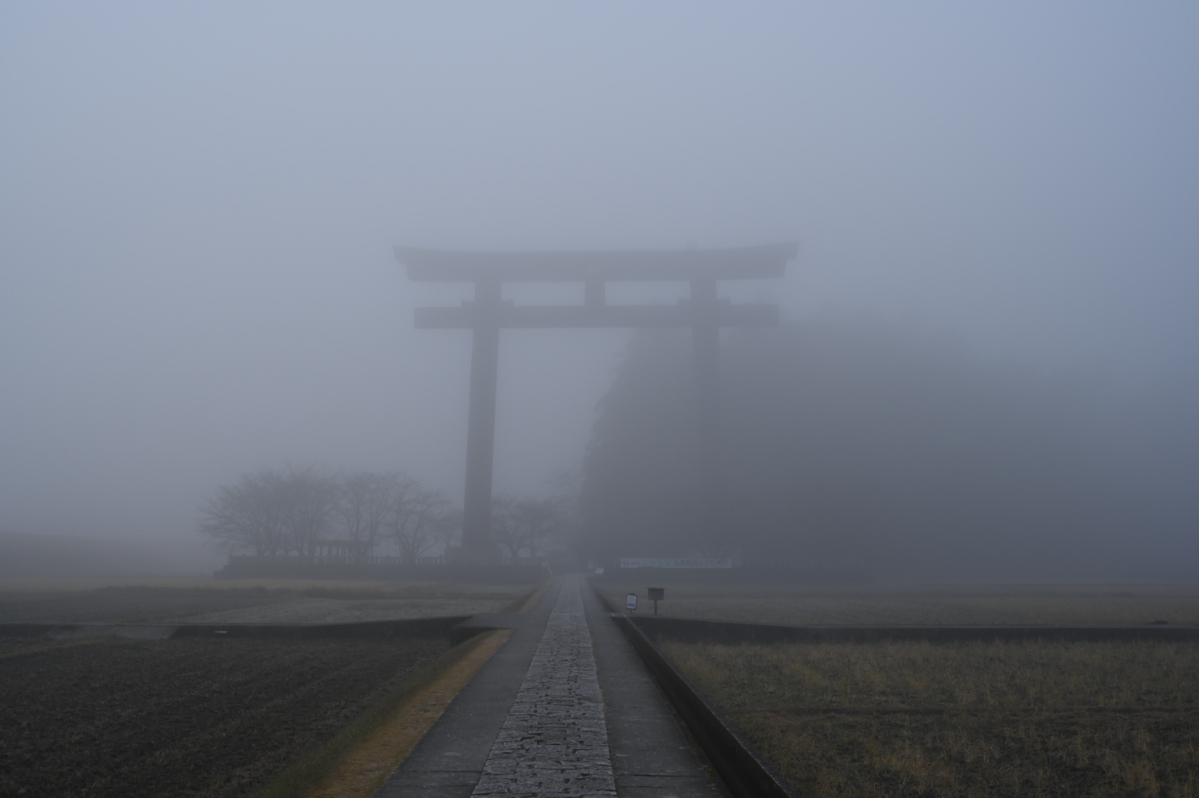 国道から小道に入り少しだけ歩くと大鳥居が見える。朝の川霧で大鳥居は霞み、ぼんやりと浮かんでいる。