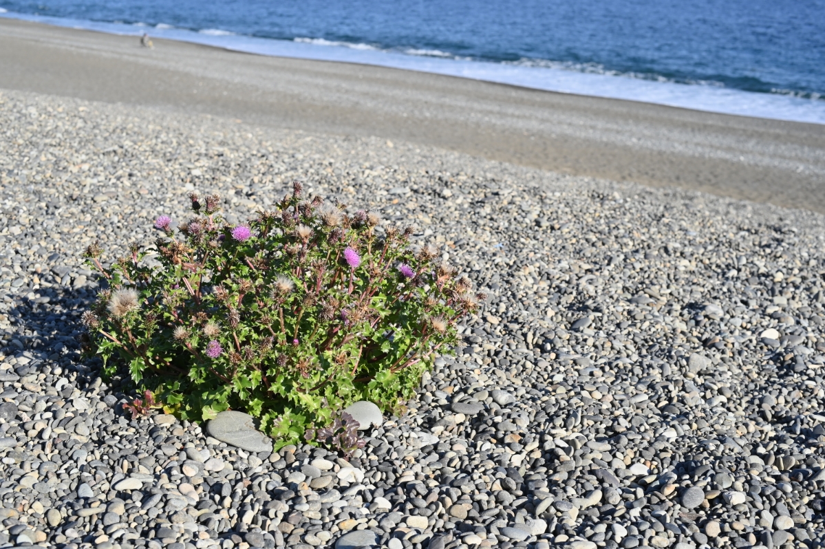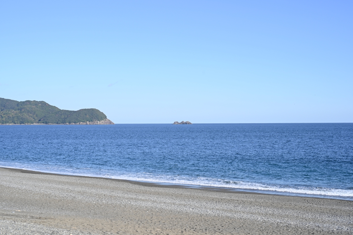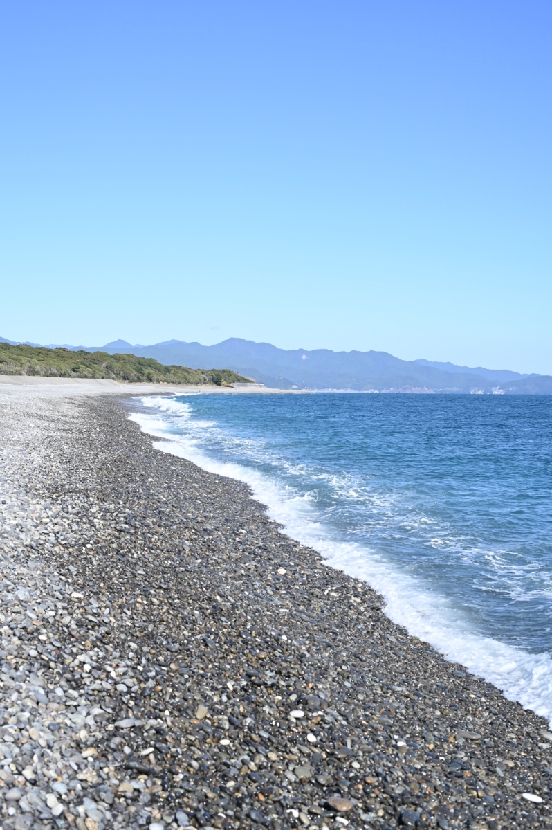 途中の道の駅に車を止めて海岸で昼ご飯を食べることにした。日差しは十分で温かみを感じるものの、風が強くて寒いので真冬のダウンを着て海岸へ行く。なだらかな海岸であるが、砂浜ではなく砂利が敷き詰められた砂利浜になっている。熊野川の河床と同じような色をしているので川が運んできた砂利なのだろう。ここは七里御浜のちょうど中央に位置しているので左右どちらを向いてもひたすら浜辺が続いている。