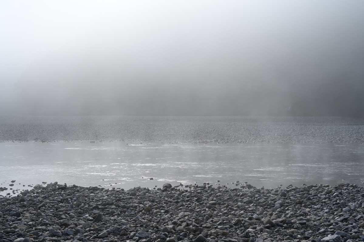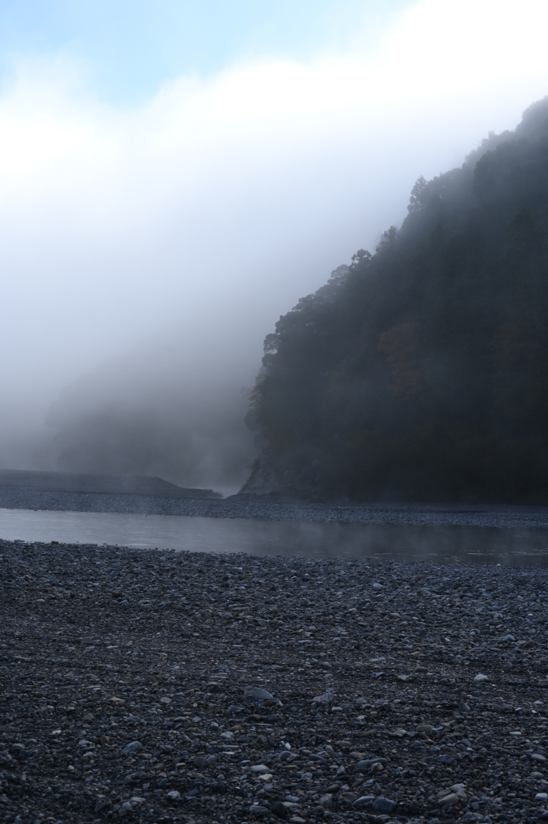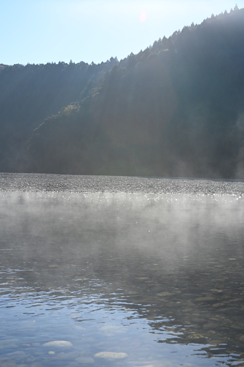 堤防が終わりになり、川が見えるようになる。川面からは湯気が立ち上り、周囲が霧で真っ白であるので川の水も乳白色に見える。河川敷も多数の玉石でできており、荒涼とした景色が広がる。霧によって拡散された光がぼんやりと届き、極楽浄土とはまさにこのような世界ではないのかと感じさせる。浄土信仰と言えば立山が有名であるが、立山も石がゴロゴロと転がり、霧に覆われた白から灰色までの世界である。紀伊半島の奥深く熊野川の大水が押し寄せるこの地に大社を築いた当時の人々もこのような景色を見て、頼るもののない太古の昔に安定と繁栄を願って建立したのだろうか。