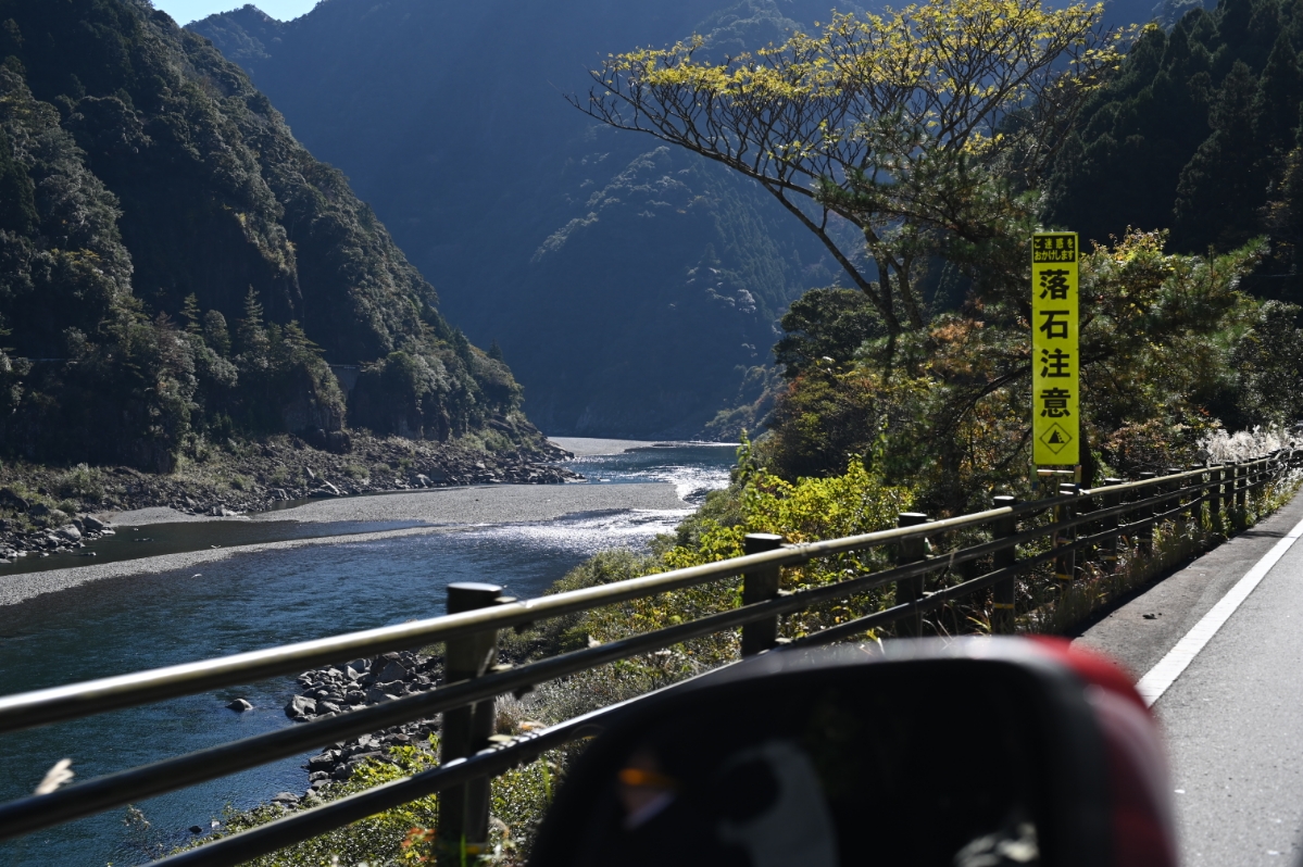 小阪交差点からしばらく走ると左から瀞峡を抜けてきた国道169号と合流。169号と言えば昨年に道路横の崖が崩壊してしまったのが記憶に新しい。長らく通行止めになって現在は仮復旧で仮設桟橋の上を片側交互通行で通っているような状態である。当面の間はこの状態が続くので片側交互の信号機はよく見る工事中の信号機ではなく、街中で見かけるような立派な信号機に変わっていた。道路の復旧は現道は諦めて新たに池原ダムの下辺りから前鬼橋まで5000m級の長大トンネルで行うそうである。上池原は前と何も変わらなかったが、前鬼橋の池原側にあった岩塊は完全に撤去されてもう少しでトンネル掘削の工事ヤードができそうな雰囲気であった。国道169号の池原ダム湖畔の区間のうちで最も道が険しいのが当該区間であるので、このトンネルができれば随分通行が楽になるだろう。