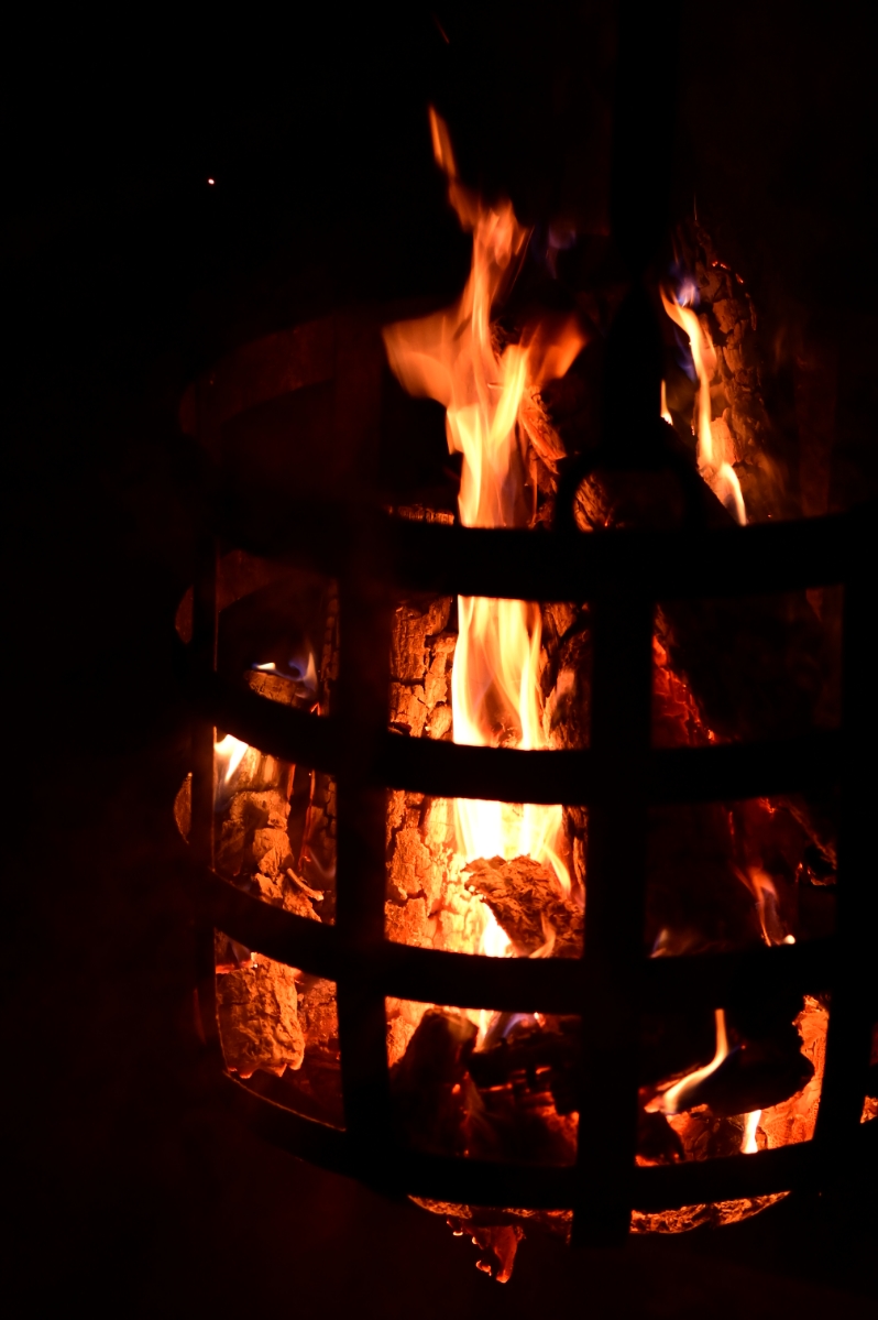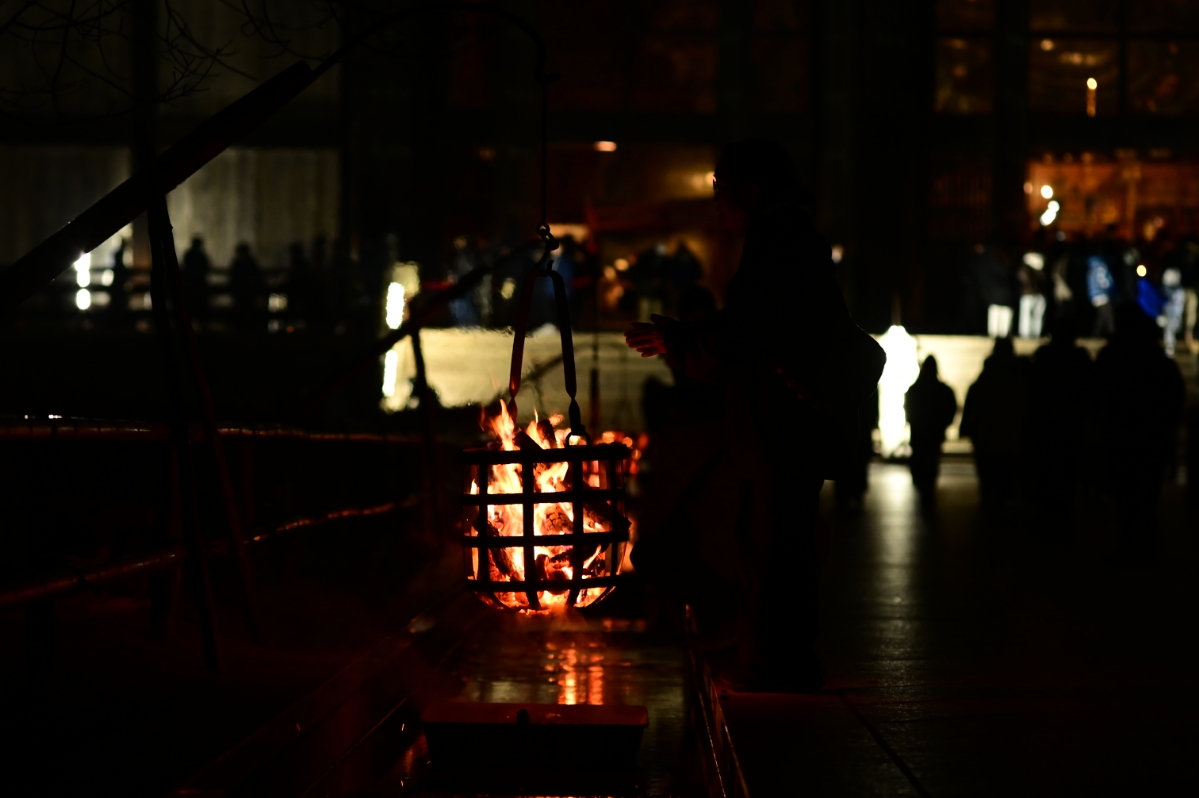 中門を通り抜け大仏殿の前に出る。今年は珍しく無風だったので焚火からはまっすぐに煙が天高く立ち上り、ライトアップの光が届かないところまで続いている。パチパチと薪が弾ける音が聞こえ、ときおり崩れて下に溜めてある水にジュオーッという音を立てている。
