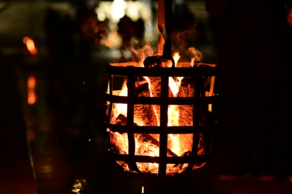 今年は池の周りで歩道の工事をしているので、大きな焚火はなく少々寂しかったが中門の前ではしっかりと二つの焚火が設けられていた。